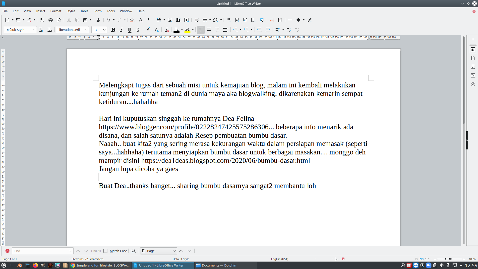 So, itulah tugas dari kelas Nulis & Ngeblog Itu Asyik! Yaitu mengedit tulisan teman. Saya ditunjuk mengedit blog Simple & Fun Lifestyle. Lumayan tulisannya singkat, gak banyak kayak tulisanku sendiri. Enteng... Eh tetiba aku kasihan sama yang edit tulisanku, semoga dia bisa selesaikan tugasnya sebelum deadline kelas berlalu.