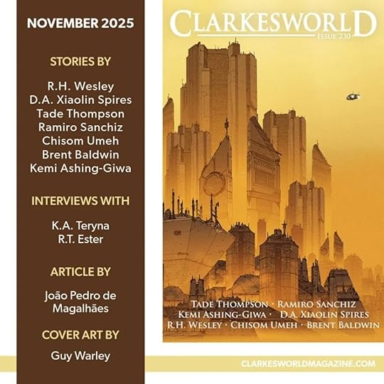 A story I translated from Spanish by Ramiro Sanchiz, “Trees at Night” (Árboles en la noche) is in the November 2025 issue of Clarkesworld Science Fiction and Fantasy Magazine. A podcast of the story is read by Kate Baker.