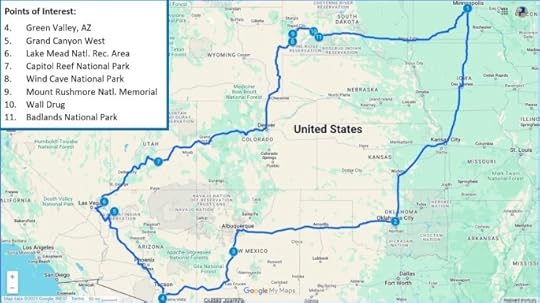Part 2 of this travel blog series described the places of interest we saw in and around Green Valley, AZ. This final installment describes the fun stuff we did as we drove back home to Minneapolis. As a reminder, here is a map of the overall journey, including the main points of interest covered in this installment: