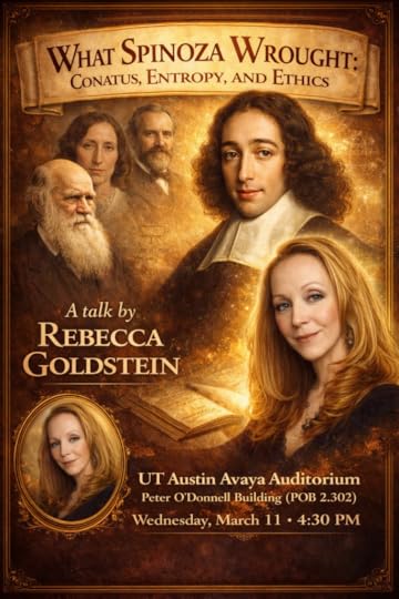 I’ve been a huge fan of the philosopher-novelist Rebecca Newberger Goldstein ever since I read her celebrated debut work, The Mind-Body Problem, back in 2005. Getting to know Rebecca and her husband, Steven Pinker, was a highlight of my last years at MIT. So I’m thrilled that Rebecca will be visiting UT Austin next week to give a talk on Spinoza, related to her latest book The Mattering Instinct (which I’m reading right now), and hosted by me and my colleague Galen Strawson in UT’s philosophy department. More info is in the poster below. If you’re in Austin, I hope to see you there!