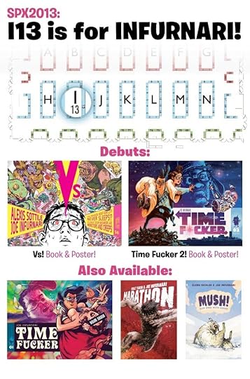 Hey SPX people! George O’Connor and I will be holding down the fort at table W38 this weekend. As you can see from the tasty graphic above, I’ll have copies of the newly released The BUNKER trade, Marathon, MUSH, Vs., and both installments of the Time F*cker saga!