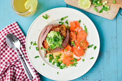 Spicy Slow Cooked Beef Stuffed Sweet Potatoes with Avocado-Cilantro Cream
