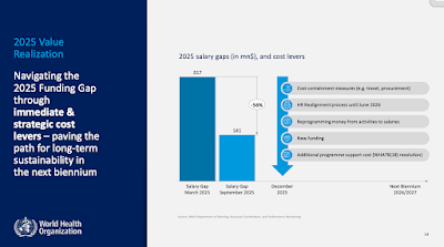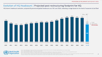 2,371 job losses and a 28% reduction in headcount. The WHO's Regional Office in Africa is bearing the brunt (who cares about Africa, eh?) with a 25% reduction in staff, but Europe is not far behind with 24%.