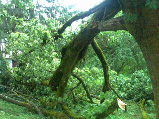 This is one of three huge maples, planted long before my father was even a gleam in the designer's eye. Due to the sheer idiocy of the arborists hired by the power company to keep the lines clear, (they cut one of the two main branches, essentially splitting the tree in half, vertically!) the resulting core rot and a brief, intense thunderstorm shattered it in half yet again. Now the poor thing will have to come down, sooner or later. Grr... It lived longer than the idiots have been in bu...