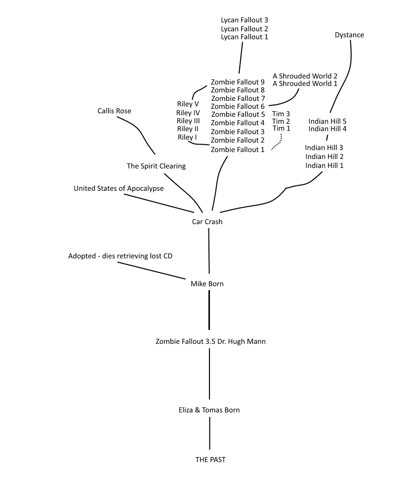 So I've got this big old blog and I do so damn little with it! I suppose I could do some bitching about some injustices in the world but that gets so old. Screw it, I'll let the haters spew on their own sites. Where the hell am I going with this? Oh yeah! I'm finally going to post something LOOOOONG overdue. Padraig Skelly a reader and fan came up with this book tree that shows how all of the books diverge from a central theme. I hope this helps folks that are looking to figure out how they all interweave!