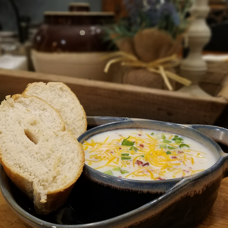 Right before serving, stir in potato buds a little at a time while stirring constantly to thicken. Serve with shredded cheese, bacon bits, and oyster crackers.