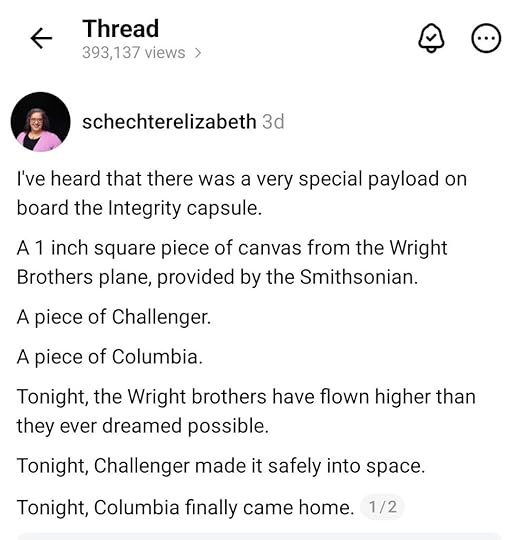 Friday night, we went out to dinner, and I made SURE that we were home in time to watch Artemis come home. And once she was down and safe, I posted something to my social media. And… it certainly took off.
