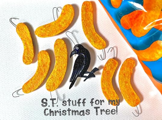 These are real Christmas ornaments. I made them for a book contest and won. Plus, who doesn't love cheese puffs? Santa would gobble them up. Now, follow the rules...