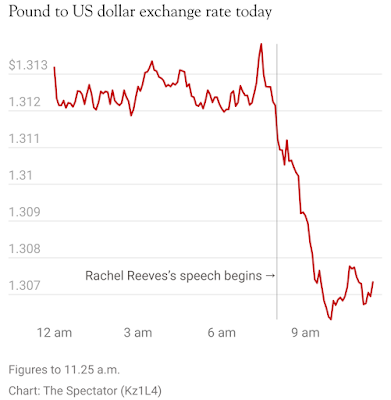 Today, I noticed a graph published by the Spectator magazine. I have nothing against the Spectator - I don't always agree with its politics, but it is a good read. However, this particular graph was egregious in its axis mangling. The intent was to demonstrate the impact that the speech given by Rachel Reeves (UK chancellor at the time of writing) on 4 November had on the pound/dollar exchange rate. It looked like this: