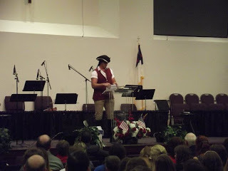 Funny story: After arriving at the venue, I realized that I had all of the parts to my colonial outfit (shoes, hat, wig, sword, etc) except my shirt. Then I realized I didn't have enough time to go home before "the bright lights hit me." So ... I went without a shirt! :0) Just kidding. I talked to one of the DAR ladies who had been a curator at the Charlotte Museum of History before, and she knew where some clothes were at the museum. Turns out ... they had the exact same shirt and size that I needed hanging in their wardrobe. Go figure! Another way of saying that: go God!
