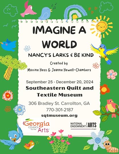 Several years ago, in a story of magic and awe that I’ll tell you about in installments here ‘n there, I met Maxine Hess, and now here we are – collaborating on an exhibit at the Southeastern Quilt and Textile Museum in Carrollton, GA. We call the exhibit Imagine a World: Nancy’s Larks and Be Kind, and we are creating the world we want all y’all and us and our families and future generations to inhabit. The exhibit opens September 25, 2024 with an Artist Mix ‘n Mingle from 4 to 6 p.m. Here’s where you can watch it unfold, get more information, ask questions, and hopefully come say Hey to our faces when we’re there.