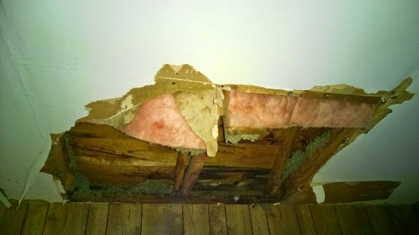 That is until our last hard rain and I truly found out how bad things really were and knew the funds that I had wouldn't come close. The ceiling in their back room came crashing down and all I could think was "Thank God no one was in that room!"