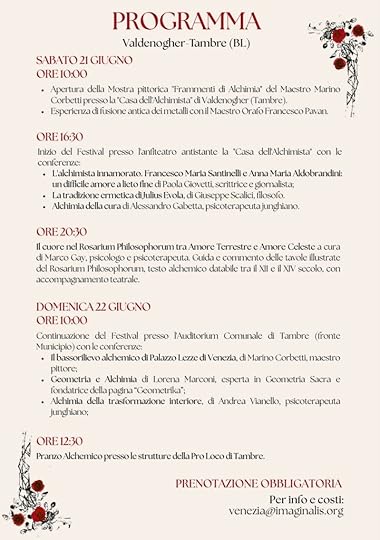 • Apertura della 𝗠𝗼𝘀𝘁𝗿𝗮 𝗽𝗶𝘁𝘁𝗼𝗿𝗶𝗰𝗮 “𝗙𝗿𝗮𝗺𝗺𝗲𝗻𝘁𝗶 𝗱𝗶 𝗔𝗹𝗰𝗵𝗶𝗺𝗶𝗮” del Maestro Marino Corbetti presso la “Casa dell’Alchimista” di Valdenogher (Tambre). La mostra e la Casa Museo saranno visitabili per tutta la durata del Festival. In esposizione anche “La Tavola di smeraldo” realizzata a Burano ed il leggio “La Pietra”.