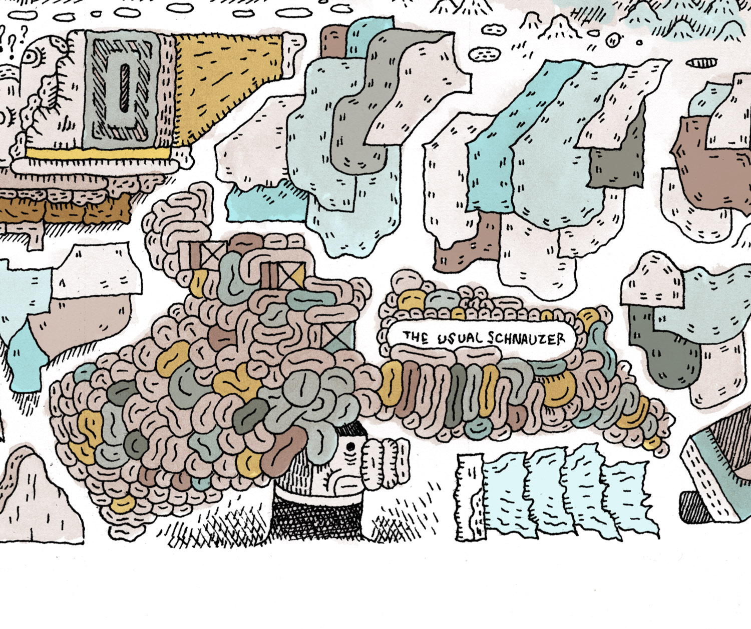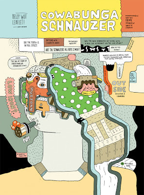Marc drew a series of comics for Maisoneuve last year and these are all in here in full colour. Also, Cowabunga Schnauzer features several thoughtfully arranged details from new artworks including “Mr. Giant Stroller”, “Lucy Honeychurch”, “On/Off Solo Schnauzer Live!” as well as a re-worked text piece based on a story about M.J. and his personal physician. As if that were not enough Half World Books arranged to print a modified version of Marc’s appearance in the March 2013 issue of Esquire UK. Printed in a very limited edition of 100 for the occasion of Marc’s appearance at TCAF this year, Cowabunga Schnauzer Promises you that: “Heavens to Murgatroid, this Place is Filled with Art Animals”.