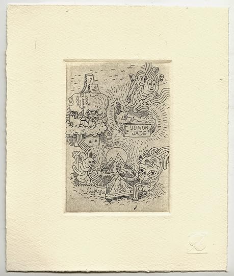 Item: Went to Dawson City, Yukon. Made some stuff, including an intaglio print with Paul Hammond and Seth Smith. Printed by New Leaf Editions. This has not been "editioned" (numbered and signed) yet, but it will be. I think that is one of Sharkey's cat hairs on there. Her new spot is the top of the scanner. Who cares!