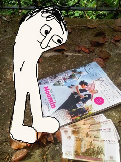 Item: I went to Russia via Finland! A guest of Boomfest! Very cool. Here I am at the end of my trip looking at what I am returning with: some leftover rubles and an inflight magazine featuring Moomin Weddings. You know who this stuff is for? Not the Queen of England that is for sure! Who do you think I am??