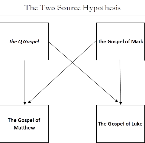 Note: Withthe Two-Source Hypothesis, it is believed that the Q gospel was the firstwritten. Mark was then composed second, followed by Matthew, and finally theGospel of Luke. The Gospel of John is considered separate from this group ofgospels.