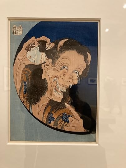 We went to the Hokusai exhibit at the Bower’s Museum this month, and while I thought all of it was pretty great–the Great Wave is, in fact, great–two pieces in particular tickled my fancy. One: this terrifying demon-hag, holding what appears to be someone’s head and pointing like she’s taking a selfie (note my silhouette in the glass behind her. It’s not really a selfie, y’all).