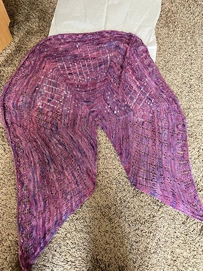 I made this for my mother’s 80th. It’s the Dazzling Dominos pattern in hand-dyed 100% silk. The photo is rubbish and doesn’t do justice to the sheen. Silk is lovely and it took the color well (I ended up double-dyeing it to really get deep pinks). Silk is also slippery and a pain in the butt to work with. Not sure I’ll seek it out unblended again.