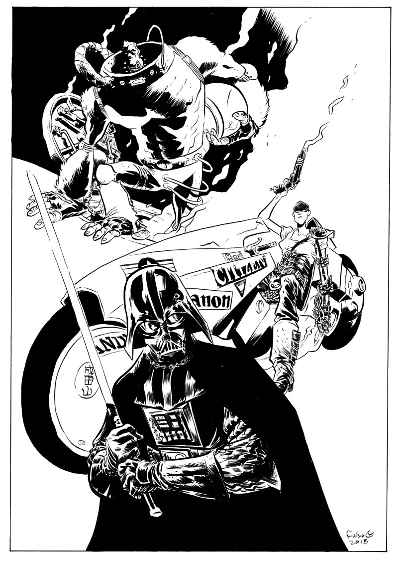 I am opening a NYCC pre-show commission list for those interested in having an original drawing by me with the character (or characters) of their choice, and I did the drawing below on Sunday to give people an example of what to expect, and to see for myself how would it feel to draw well established pop culture characters. I have spent most of my career drawing my own characters, and I almost never do commissions, so this is an experiment on several levels, which I decided to test from here until October when I go to New York. Some mysterious part of my brain decided that I have time to do that on top of drawing the pages I have to do, so I guess we'll find out.