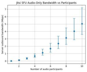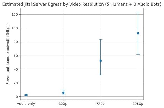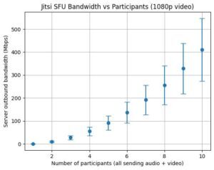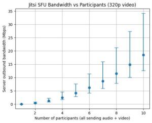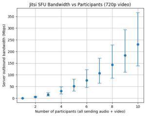 Limiting to audio means that with my table it’s estimated to average around 2.5Mbps upstream, well within my upstream bandwidth. But add 320p video and that more than doubles to an average of 5.5Mbps, and a maximum that exceeds my upstream. 720p resolution or better has even higher bandwidth requirements for the server, even if you’re limiting the number of outbound video streams. (Graphs of estimated upstream bandwidth for audio versus video resolution without any limiting are at the end of the post to give you an idea of what you might need for what you want to do.)