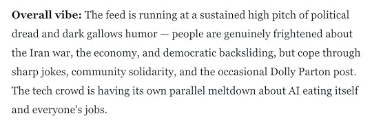 ![Screenshot of 3 posts: Laurie Voss @seldo https://zeitgeist.blue is a multi-social-network app that summarizes your feed for the last 24 hours to let you catch up with doomscrolling. Now with support for Mastodon! [Embedded link to: zeitgeist.blue Zeitgeist Summarize your Bluesky, Twitter, or Mastodon feed] Jan Lehnardt @janl@narrativ.es @seldo how can I make sure my posts are never used by this app to be sent to an LLM vendor? Laurie Voss @seldo@alpaca.gold @janl You would need to block me from following you, I suppose.](https://i.gr-assets.com/images/S/compressed.photo.goodreads.com/hostedimages/1774955384i/37669533.jpg)