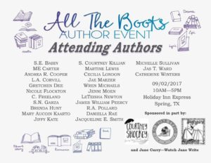 For anyone that lives in the Houston area or has plans to be in the Houston area in September… I will be one of SEVERAL authors that will be signing at the All The Books Author Event on September 2nd. This will be my very first book signing/author event so I am a mixture of excitement and nervousness, but mostly excitement!