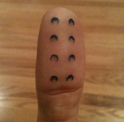 And here I have to tip my cap to brick artist -- Nathan Sawaya. In addition to designing an amazing cover for the book, Nathan has unveiled his latest design, which happens to be on his thumb. It's a tattoo that looks like an ink-pressed version of eight studs -- the classic configuration of a 2x4 rectangular LEGO brick.