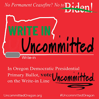 If you are a Democrat in Oregon, I urge you to fill in the write in bubble and write in Uncommitted for your vote in the Oregon presidential primary. If you are an unaffiliated voter, like me, debating whether or not to change your affiliation for the primary, that's a decision you have to let your conscience guide you in making. I encourage you to vote your values and make your voice heard. Ballots are due May 21st.