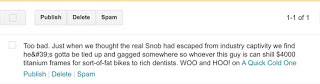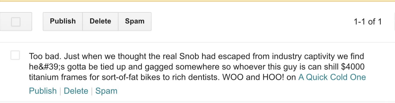 The above is a comment I deleted from someone who is pathologically obsessed with my integrity for some reason.  I can only assume that my influence over them is so profound and all-consuming that they can't help but buy every single thing I mention on this blog, even $4,000 titanium frames, and I imagine them screaming, "Oh god, please no, make it stop!" as they click on the "Confirm Purchase" button with trembling hands and sweat streaming down their brow.  As for the rest of you, I trust you understand that the mere existence of a $4,000 Jones titanium frame does not require you to purchase it, and that you can also buy a complete steel Jones for half that--or even no Jones at all!