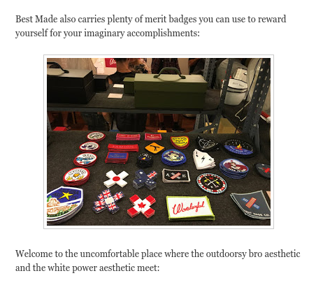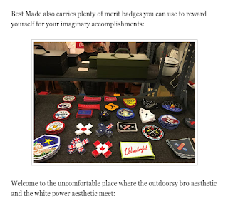 Anyway, it occurs to me that there's something about Best Made I never understood until now.  See, my son recently joined the Cub Scouts, and not too long ago we went to the Scout Store up in Westchester to get him his uniform and scouting sundries.  Never having been a Scout myself, the Scout Shop was a new experience for me, and it was, to put it simply, awesome.  Pocket knives, camping supplies, handbooks on every conceivable subject...  And only now as I read this latest axe article do I realize that the Best Made Co. is just a Scout Shop for adult douchebags.  It's so simple!  I mean I was sort of circling around it when I mentioned merit badges in the Specialized post: