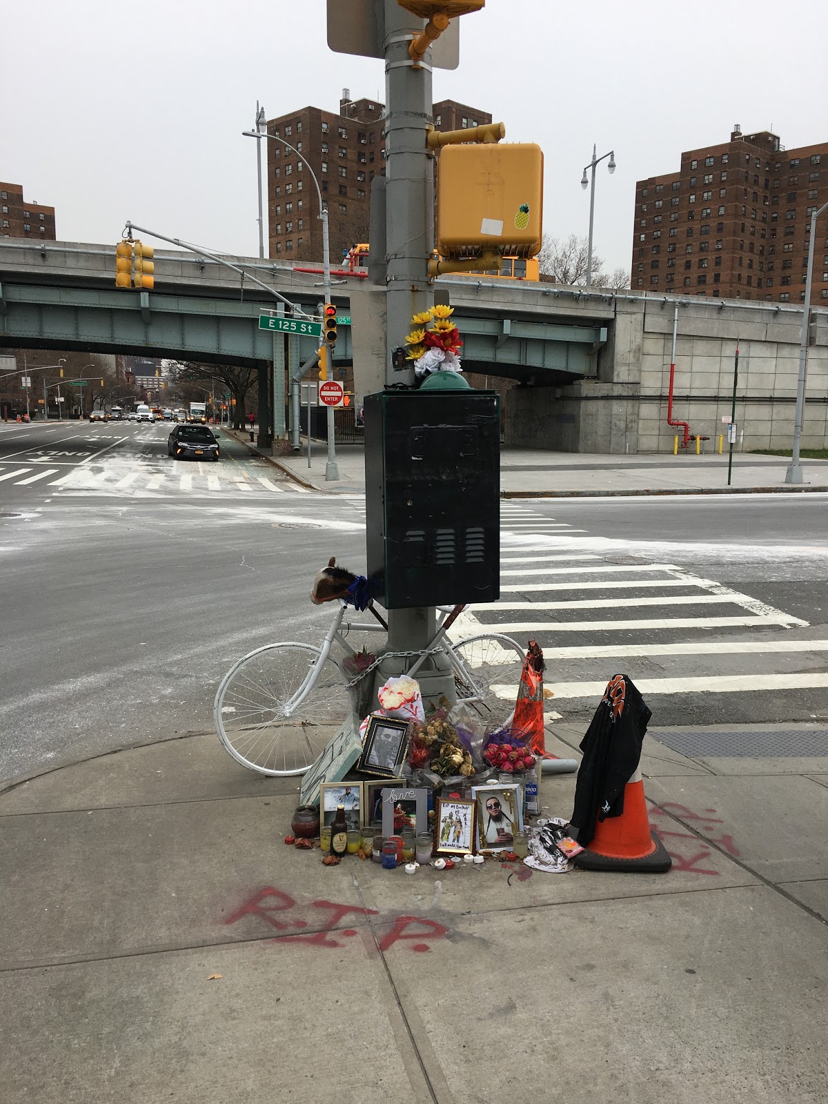 Please note that I did not take this picture today.  Today was grey and cold with snow flurries, and the streets were so heavily salted I'm still coughing up white clouds.  Unfortunately I only managed one photo before my phone died, and it was of wrestler Matt Travis's ghost bike at the foot of the Willis Ave. bridge: