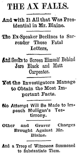 Before he could do so, Blaine met with Fisher and Mulligan to assess their intentions and the contents of the letters. Meeting alone with Mulligan, Blaine asked to look over the correspondence. Mulligan handed him the letters — and then Blaine refused to give them back. After Mulligan testified about the confiscation, Blaine faced the worst crisis of his political career. “THE AX FALLS. And with It All that Was Presidential in Mr. Blaine,” the Chicago Tribune proclaimed.6