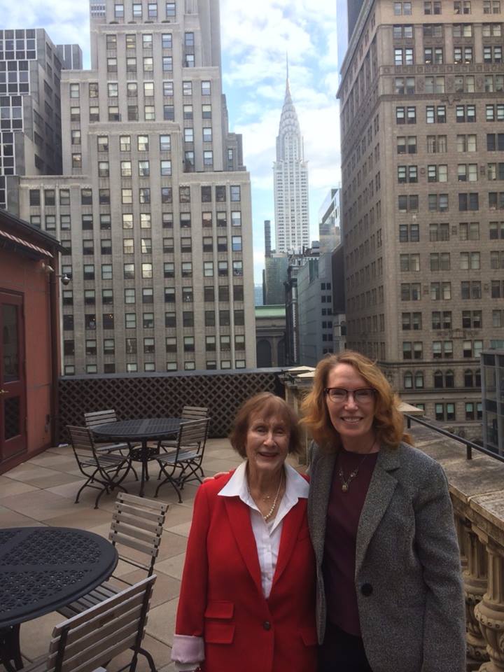 Kit Reed and Sydney Duncan on the Century Club's rooftop patio in Manhattan, with the Chrysler Building in the background, January 2015.