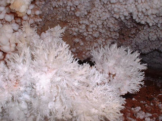 After the water that formed the cave drained, speleothems (cave formations) began to form. Jewel Cave contains all the common types of calcite formations, such as stalactites , stalagmites , flowstone , and frostwork , although not in the same abundance as other well-known caves. The dry parts of the cave contain some formations created by the deposition of gypsum, such as gypsum needles, beards, flowers, and spiders. Finally, Jewel Cave contains a very rare formation called a hydromagnesite balloon. Those are created when gas of an unknown source inflates a pasty substance formed by the precipitation of the magnesium carbonate hydroxide mineral." - from park website.