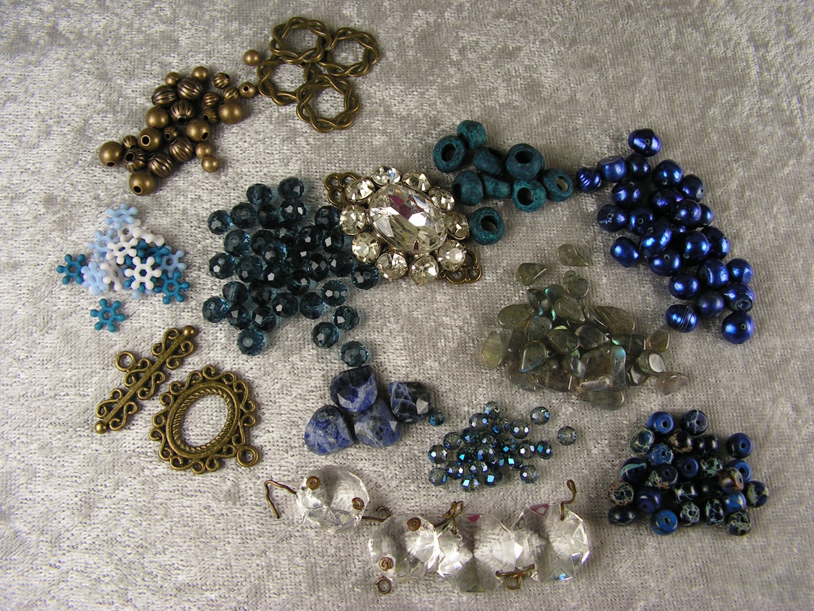 The main soup has a blue/brass/crystal color scheme. The focal is a scrumptious vintage rhinestone/filigree piece that she made herself (!!!) (anyone who knows me knows how I feel about something handmade! swoon!), a lovely brass filigree-style toggle clasp, 4 chandelier crystals, dyed impression jasper, sodalite briolettes, tiny shimmery labradorite briolettes, brass accent beads (plain and fluted), blue dyed freshwater pearls, and lots of blue crystal rondelles, along with four brass "woven" ring links, some cool blue big-hole beads, some blue/white/light blue plastic star spacers, and a couple of lengths of fiber cord - blue silk and brass-tone satin cord. WOW! What a pile of lovely stuff to play with!