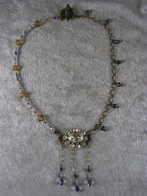 I wound up taking inspiration from the vintage Czech enamel necklaces pictured in one of my favorite eye candy jewelry idea books, Fabulous Fakes, by Carole Tanenbaum. The necklaces each feature a lovely large embellished filigree pendant, accented with dangly bits, suspended from lovely beaded strands. I thought about making it symmetrical like the necklaces in the book, really I did - I laid it out so everything matched, but it was just, well, just *too* symmetrical, and really kind of boring.