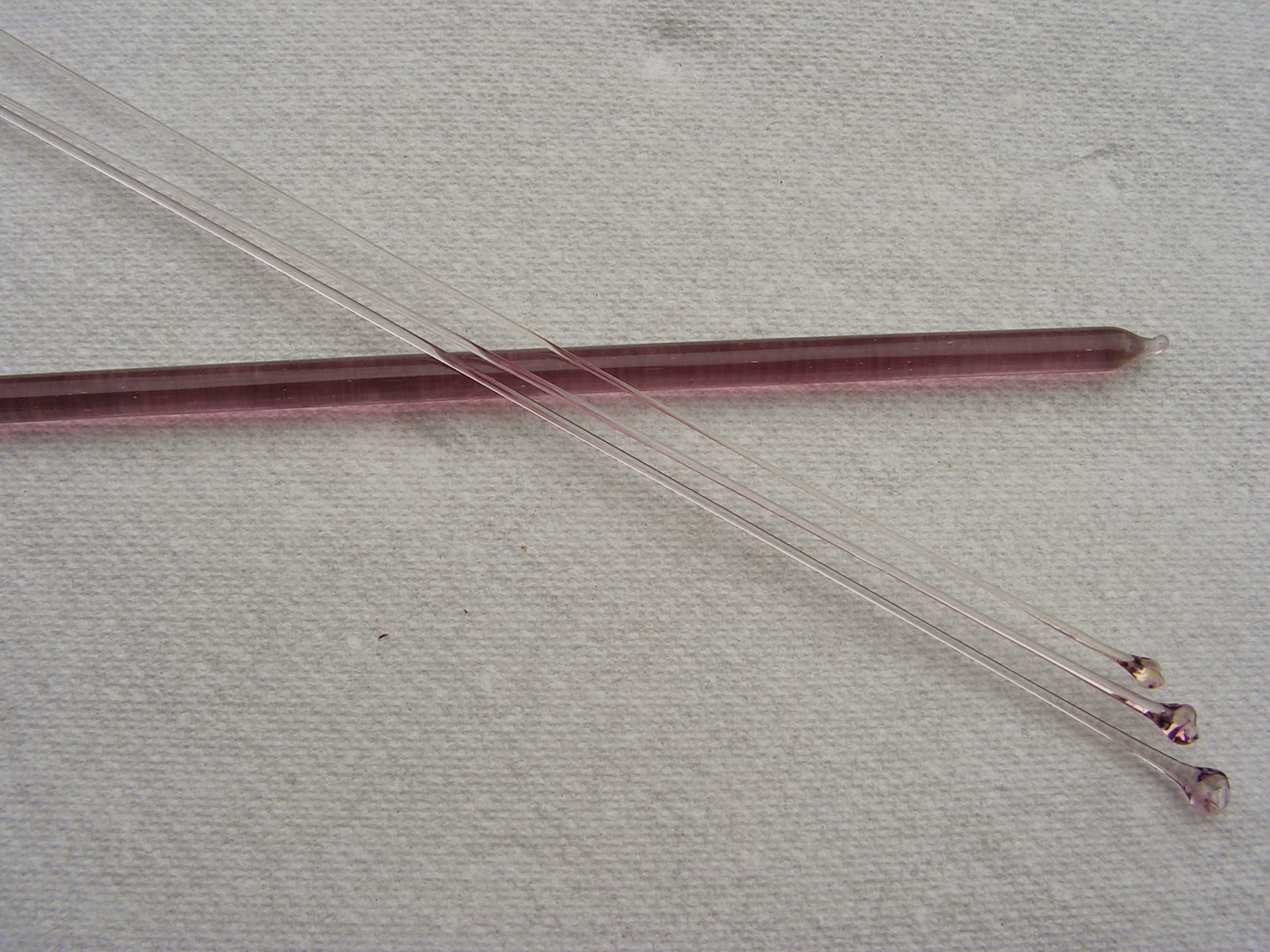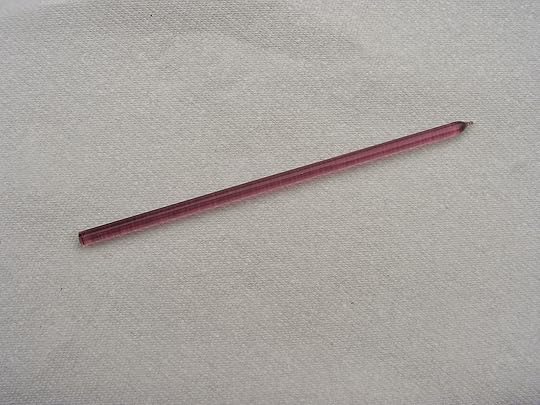 This picture is of one of the Double Helix glass rods that I use to make the Blue Galaxy Swirl beads - very DEFINITELY pink glass, no? The soft glass rods I use to make memorial beads with are all about the diameter of a pencil, and start out about a foot long.