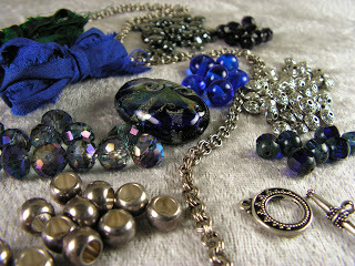 The second soup Christine sent has a purple/red/blue color scheme - the focal is a decoupage tile, which I just love, accompanied by dyed red and blue agate beads, and some gorgeous sparkly blue/grey brolette drop crystals for some serious bling. I've decided to use gunmetal findings with this color scheme - hoping I get this piece finished before the big reveal!