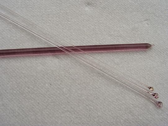 I *don't* make the Blue Galaxy Swirl beads with shards, though. I use stringers instead. Here's a picture of a few of the stringers I'll use to make my next Blue Galaxy beads, along with the original rod I pulled them from. I'd say the stringers are about 1mm in diameter or so.