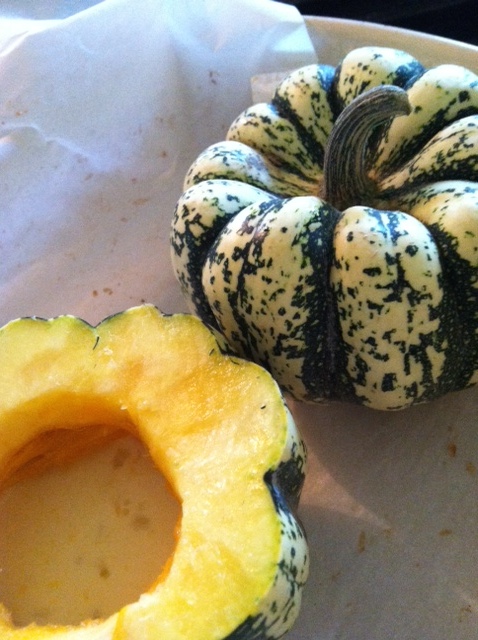 Adapted from Bake Happy by Judith Fertig.A tart shell is meant to be sturdy enough to encase a filling during baking, yet attractive on its own. But who says a tart shell has to be pastry? If we like desserts that make their own sauces, then how about a vegetable that turns into a sweet tart, complete with its own shell? Sweet Dumpling squashes (in the pumpkin family), with their striped exterior and a sunset-colored interior, are too beautiful to chop into oblivion, so let them be the star of the show. Boiling down the maple syrup first helps intensify its flavor in the custard filling.