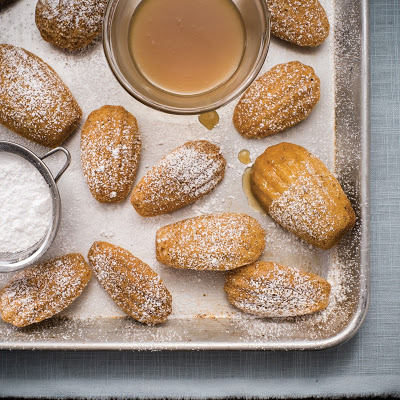 The Burnt Honey Cream is also delicious spooned over fresh fruits and pound cake. Adapted from a recipe by Eryn Chesney.Citrus and Browned Butter Madeleines with Burnt Honey CreamAdapted from Bake Happy (Running Press, 2015) by Judith Fertig.The scent and flavor of citrus and browned butter in the madeleines and the caramelized honey in the dipping sauce will transport yout to a happy place, just as Proust was in his early twentieth century novel In Search of Lost Time. Makes 24 large or 40 small madeleinesCitrus and Browned Butter Madeleines:1/2 cup (113 g) unsalted butter, plus more for the pan3 large eggs, at room temperature2/3 cup (150 g) granulated sugar1 cup (125 g) unbleached all-purpose flour, plus more for the pan1 teaspoon vanilla extract1/2 teaspoon lemon zest1/2 teaspoon orange zest1/2 teaspoon baking powderBaking sprayConfectioners’ sugar for dustingBurnt Honey Cream:1/2 cup (170 g) clover, wildflower, or other amber honey11/2 cups (375 ml) heavy whipping cream1/8 teaspoon saltFor the Citrus and Browned Butter Madeleines, melt the butter in a small light-colored or stainless steel skillet, over medium-high heat until it turns a golden brown. The butter will foam, then the foam will subside; bigger, clear bubbles will form, and in about 1 to 2 minutes from that point, the butter will start to brown. Remove from the heat and let cool until just warm.With an electric mixer, beat the eggs and sugar together until the mixture is thick and pale yellow. The mixture should ribbon from the beaters when you stop the mixer and lift the beaters up. With a spatula, fold in the flour, vanilla, citrus zests, and baking powder until smooth and well blended. Fold in the browned butter, including the browned bits, until well blended. Cover and chill the batter for at least 1 hour or up to overnight. For the honey cream, place the honey in a saucepan over medium-high heat. Bring to a boil and cook until the honey has caramelized and reduced, about 4 minutes. Carefully whisk in the cream until well blended and continue to cook until the cream has reduced, and, thickened, and coats the back of a spoon. Stir in the salt. Set aside to cool.When ready to bake, preheat the oven to 375°F (190°C). Lightly but thoroughly spray the inside of a madeleine pan; wipe out any extra baking spray foam with a paper towel, as this could interfere with the scallop shell design. Fill each cavity half full of batter. The batter will spread and fill each mold as it bakes.