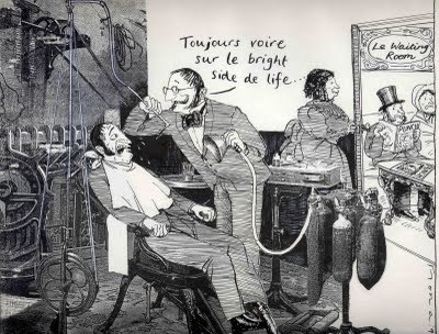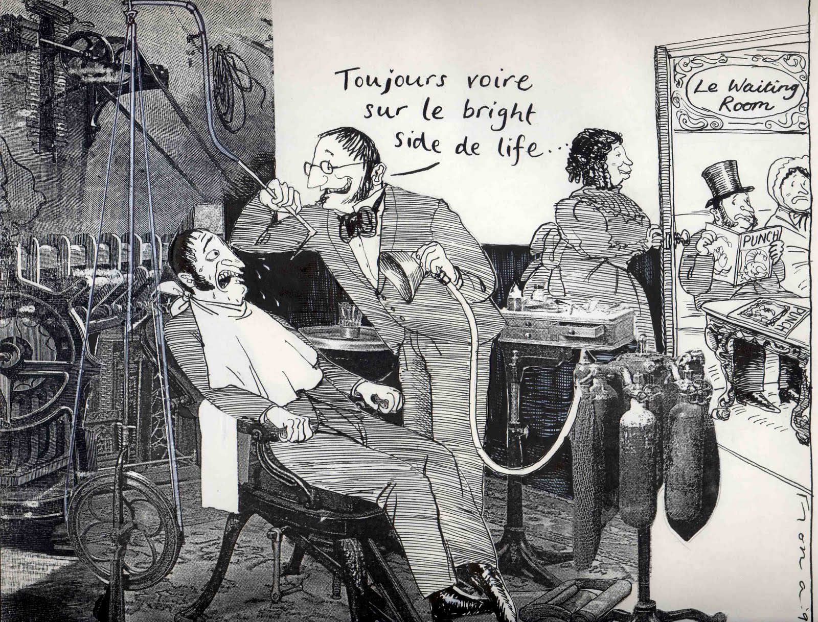 I could make a career out of going to the dentist. By the way, the above drawing lives on the wall in my house, along with half a dozen other vintage artworks by MOI. They are drawings I did for a magazine called Punch; this one is from a column by the late Miles Kington called "Let's Parler Franglais" – which is why I put in a caption in Franglais, a language he devised that could be understood by almost anyone who failed GCSE French (trivia: Kington was invited to join the Monty Python team, but declined).