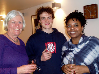 Incidentally, speaking of Siobhan Dowd: as it's Easter and you might be wondering what to do, I may as well remind you that the stage play of her book-that-features-someone-with-Asperger's-but-isn't-'about'-Asperger's, The London Eye Mystery, brilliantly adapted for the stage by Carl Miller, is on in London NOW – but be quick! It closes on April 18th.You can read Culture Witch's piece about it here, and Bookwitch's piece, which I'm linking in spite of the fact that it includes an extremely unflattering picture of me, here. Below is a picture I took at the (belated) launch party, of Siobhan's sister Oona (mother of the nephew who inspired the book!) with actors John Cockerill (Ted) and Samantha Adams (Aunt Gloria):