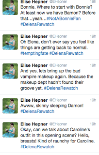 Every week I live-tweet the episodes and jabber with other TVD fans. Recaps go up every Thursday. This week was Season 1 Episode 3, "Friday Night Bites". For anyone who couldn't join me, here's my fun little recap done in Twitter screenshots.