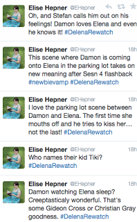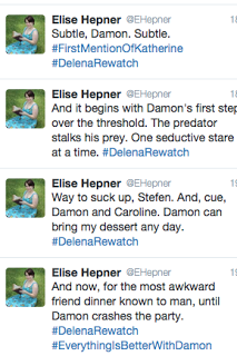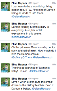 Coming your way tomorrow and every week on Tuesday on Twitter I'll be live tweeting one of my favorite TV shows and my OTP (one true pairing) The Vampire Diaries Delena (Damon and Elena). I'll be tweeting about all my favorite Delena episodes from Seasons 1-6. If you want to follow along make sure you're following me on Twitter at @EHepner and make your presence known!