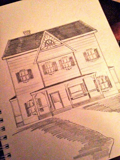 With An Unexpected Visit, I had an idea for the cover, but not the talent to follow through. I'm good with sketching, but to have a fully fleshed out design is beyond my capability. Therefore, I reached out to a friend and very talented artist, Christopher Wright (www.clwright.com), who was excited at the prospect of taking on a book cover (I believe this was his first). All I had given him was a description of what I wanted (a farmhouse with a separate garage sitting back in a field at gloaming), and this sketch I did of the house: