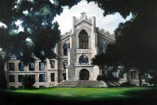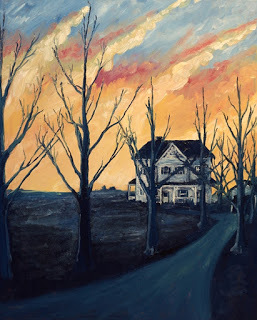 To be honest, after I get the vision of the composition, I work rather fast... it normally takes as much time to think about a commissioned composition as it does to paint one, for me no more than 3 to 4 hours. I had 1 more strong idea for the approach to the house, it was as if the viewer was closer and off to the garage (possibly one version from within the garage) side of the the house so that half the picture would be house and the other side trees and sky.