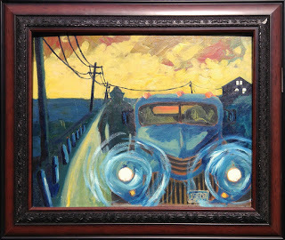 I cannot paint on a white canvas... I must mess up the surface first by painting and or scraping on acrylic paints. It doesn't really matter the colors but I always mix at least two acrylic paints together... Then once the acrylic dries, I begin with the first layer of oil paints. I will often rough out the focus of the painting with my brush with thinned oil paint. I paint with music in my studio... the music I prefer ranges a bit from Tom Waits to Morrissey to Radiohead/Thom Yorke to Portishead etc. I believe the music must be in the paintings somewhere because I take much energy from it... I have even been so influenced that I have titled works after certain songs.
