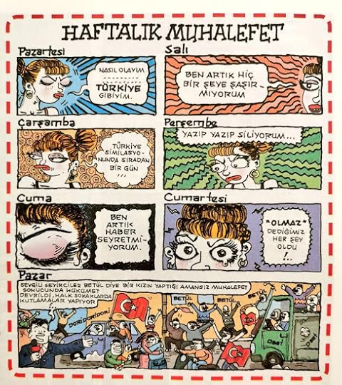 Umut’unkarikatürü, story’lerde paylaşılan afişler, like’lanan kampanyalar ve “yazıpyazıp silinen” cümlelerden oluşan bugünün muhalif jest ekonomisini, Betül’ünhaftalık ruh hâli üzerinden gayet akıllıca evirip çeviriyor.